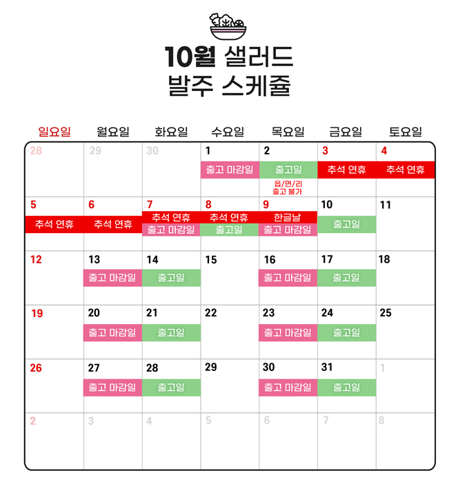 예시) 4일(화요일) 출고를 선택하고 4일 오전에 결제한 경우 : 그 다음 회차인 6일(목요일)에 출고됩니다.